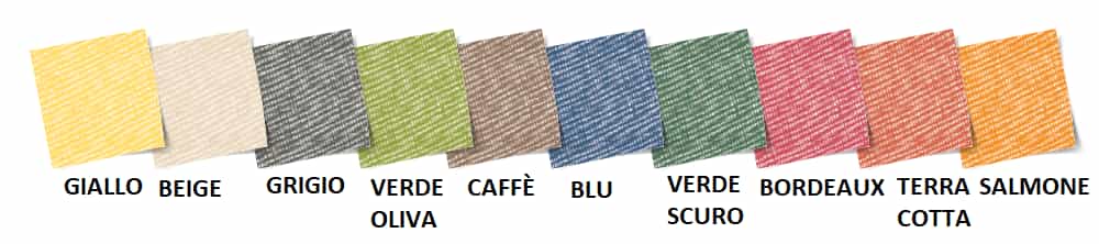 Giallo, Beige, Grigio, Verde oliva, Caffè, Blu, Verde scuro, Bordeaux, Terracotta, Salmone
